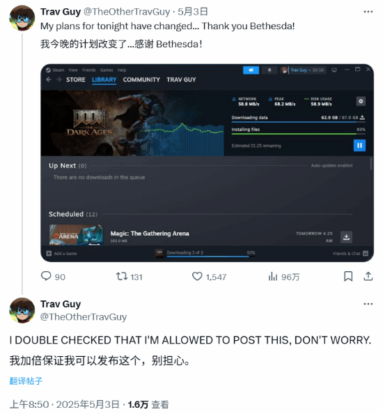 他本人也在评论区强调,自己发这个提前下载试玩的截图已经得到了B社许可。