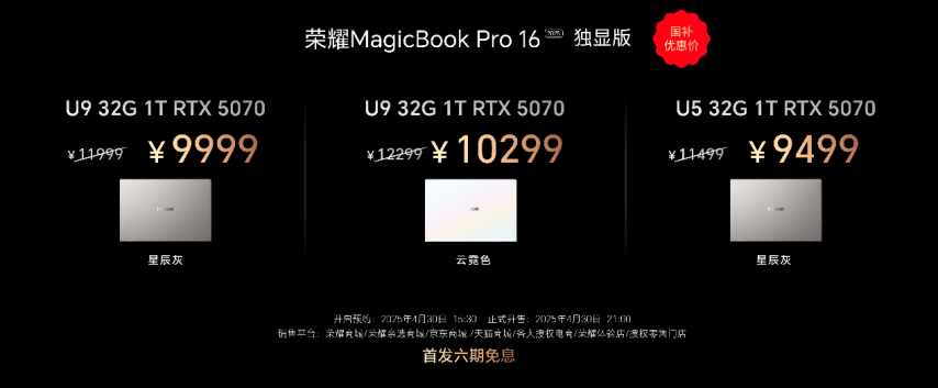 荣耀MagicBook Pro 16 2025提供独显和集显两种配置,满足用户的不同预算需求。其中,搭载RTX 5070独立显卡的荣耀MagicBook Pro 16 HUNTER版2025国补到手价9499元起,4月30日21:00全渠道首销;集显版国补到手价5039.2元起,4月30日15:30全渠道首销,想抢先体验的用户可以抓紧时间入手。MagicBook Pro 16 2025RTX 5070MagicBook Pro 16 HUNTER2025949943021:005039.243015:30