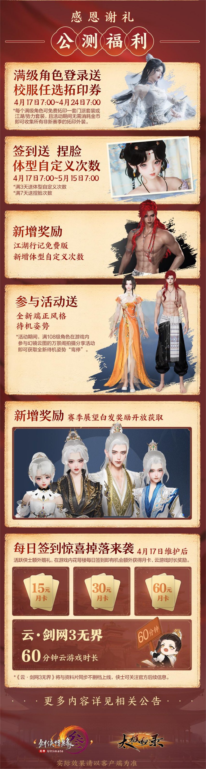 新赛季诸多丰厚的公测福利等你来拿!登录即领校服任选拓印券,幻镜云图的万景阁拍摄分享活动送待机姿势奖励,江湖行记免费版新增体型自定义次数好礼,新赛季快乐焕新貌,让各位侠士以自己喜欢的样子游历大美江湖!